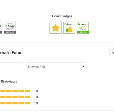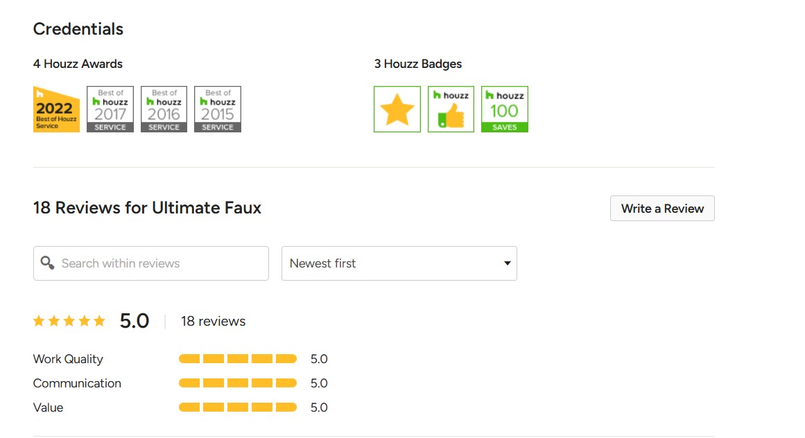 I have worked with many specialty painters but after having worked with Ultimate Faux, they all pale in comparison. Joline's knowledge of finishes of all types, and her eye for perfecting every color is incredible. After working with Joline and her crew on many projects, I have been more than delighted with the completed job. Each of her crew bring their own expertise to the table and together as Ultimate Faux create a flawless perfection when finished. Always on time, on budget, and after tenting whole areas before beginning any job, they leave the site cleaner than when they began, which is a tremendous bonus for any homeowner.. Talented, gracious, and always ready to work to achieve the finish I requested Ultimate Faux is my number one company to call on for all specialty painting..